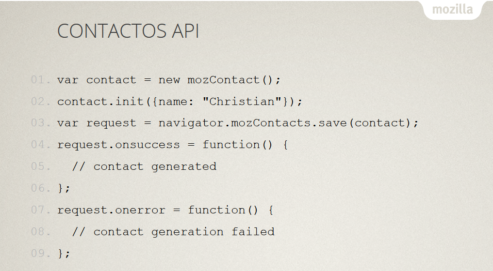Para una aplicación privilegiada es simple crear un nuevo contacto. Esto te permite sincronizas libretas de direcciones entre servicios, por ejemplo. Nuevamente, tienes algunos métodos y manejadores de eventos disponibles para poder manejar los éxitos y fallas.<header>