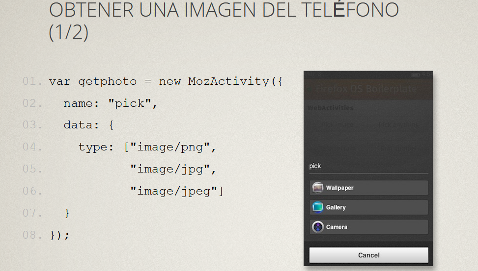 La actividad ‘pick’ es probablemente una de las más útiles, porque le dice al usuario que quieres algo del dispositivo. En este caso definimos en la matriz de tipos MIME que estamos esperando una imagen. Esto puede terminar como la captura que se muestra a la derecha, se le pregunta al usuario si quiere darnos una imagen, ya sea de la carptea de fondos de pantalla o de fotos, o tomar una nueva foto con la cámara.