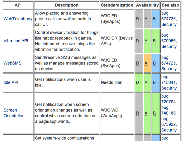 El trabajo de Mozilla en las WebAPI se cuenta e informa en el wiki.
