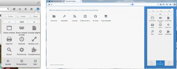 Otro aspecto es que el botón Firefox es reemplazado por un botón de tres líneas en el lado derecho que contiene tanto el nuevo menú principal (con opciones inmediata como copiar o pegar elementos, cambio en el zoom de la página) como el nuevo panel de personalización.
